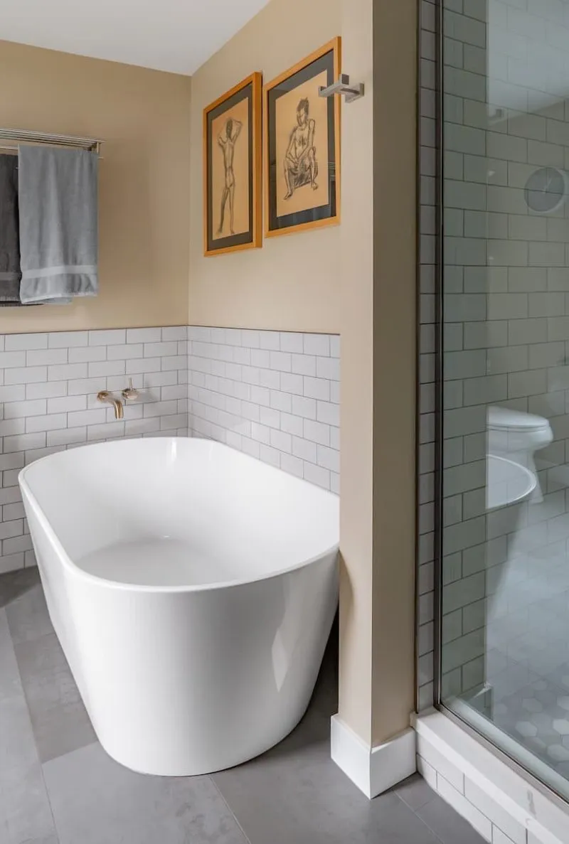 - Curbless walk-in showers, soaking tubs, and full-surround tile installed over a properly waterproofed substrate. We do the waterproofing ourselves — it's not subbed out — because it's the step you can't fix after the tile is on.